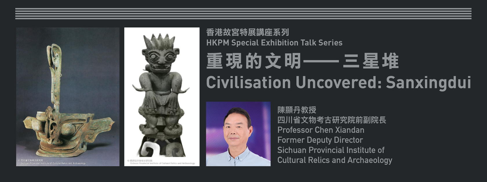 This talk accompanies the special exhibition “Gazing at Sanxingdui: New Archaeological Discoveries in Sichuan”, on view in Gallery 8 at the Hong Kong Palace Museum from 27 September 2023 to 8 January 2024. The exhibition features 120 remarkable bronze, jade, gold, and pottery objects from around 2,600–4,500 years ago. Nearly half of these were unearthed in the most recent excavations at the Sanxingdui site between 2020 and 2022, and many are being exhibited outside Sichuan for the first time. This exhibition is jointly organised by the Hong Kong Palace Museum, the Sanxingdui Museum in Guanghan, and the Jinsha Site Museum in Chengdu, with the support of the Sichuan Provincial Institute of Cultural Relics and Archaeology and the Chengdu Institute of Cultural Relics and Archaeology. Bank of China (Hong Kong) is the Sole Sponsor of this special exhibition.