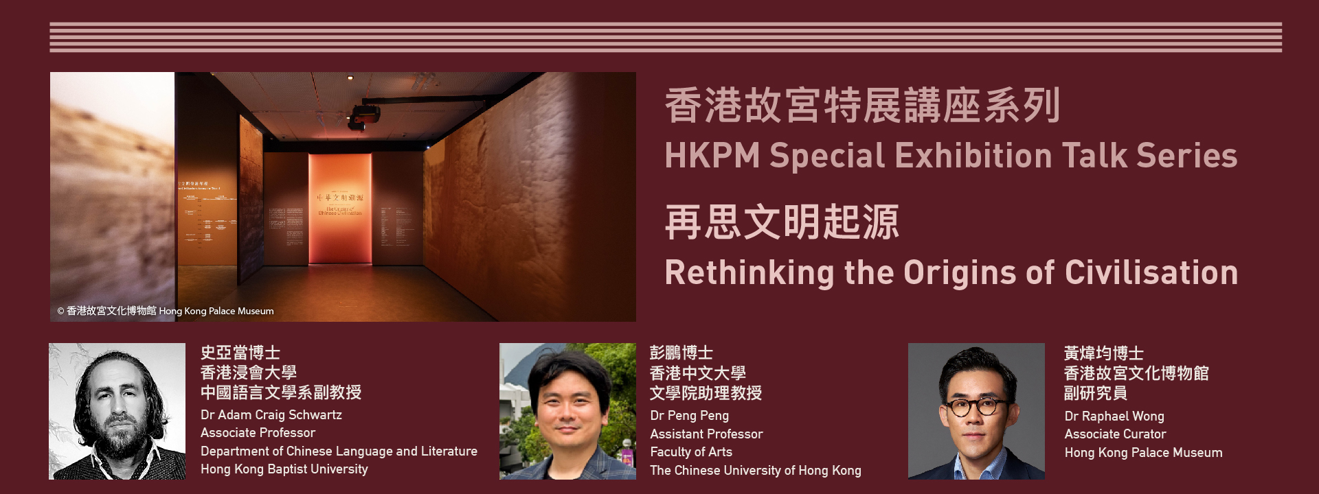 “冶金术” 和 “文字” 常被视为定义文明的重要要素。香港故宫文化博物馆副研究员黄炜均博士将会在讲座中分享中国银行(香港)呈献:“中华文明溯源” 特别展览背后的研究基础;而史亚当博士和彭鹏博士会介绍中国早期的冶金术及文字历史。三位学者将会进行对谈,一同探讨中华文明的概念和发展。