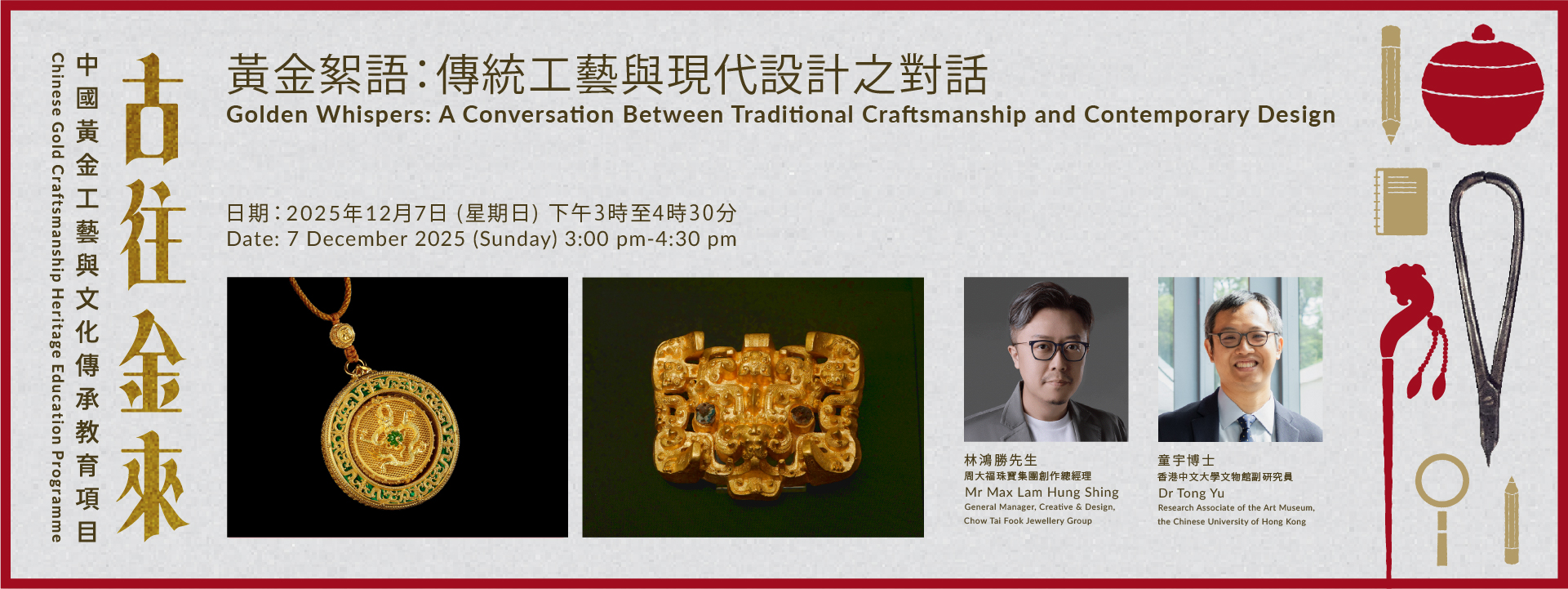 此外,香港故宮文化博物館研究員侯怡利博士將會與兩位講者進行深入對談,探討傳統金器工藝如何在當代設計中延續與轉化,並聚焦於香港故宮文化博物館夢蝶軒收藏在推動中國金器工藝研究與文化傳承教育方面的角色。