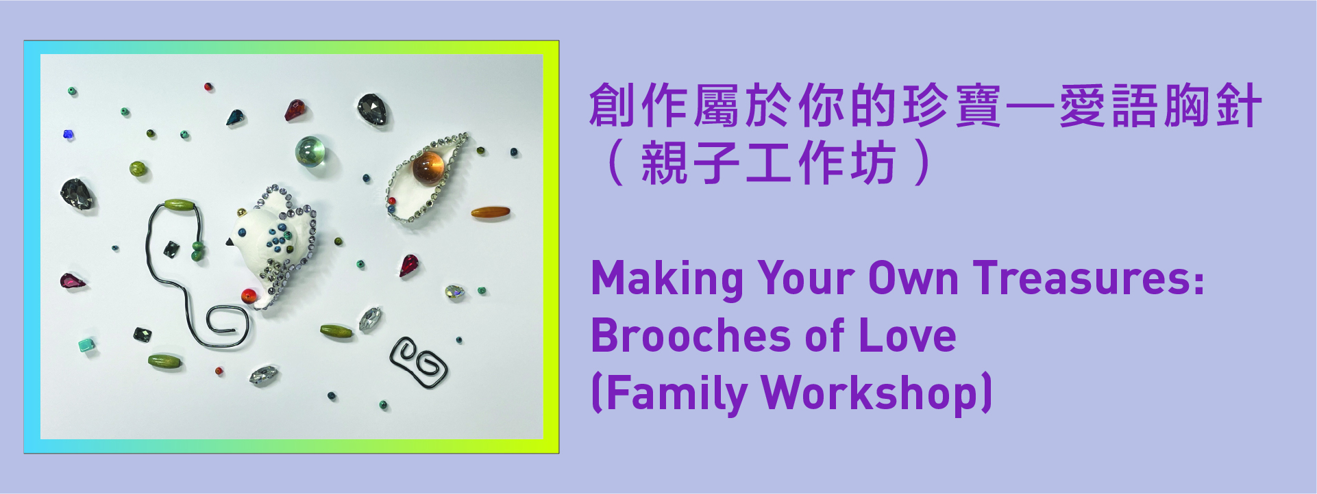 通過有趣的小遊戲和故事,參加者可認識珠寶設計的符號密語。小朋友和家長可一同設計獨一無二、象徵家庭間尊重與愛的胸針,體驗美好的親子藝術時光。