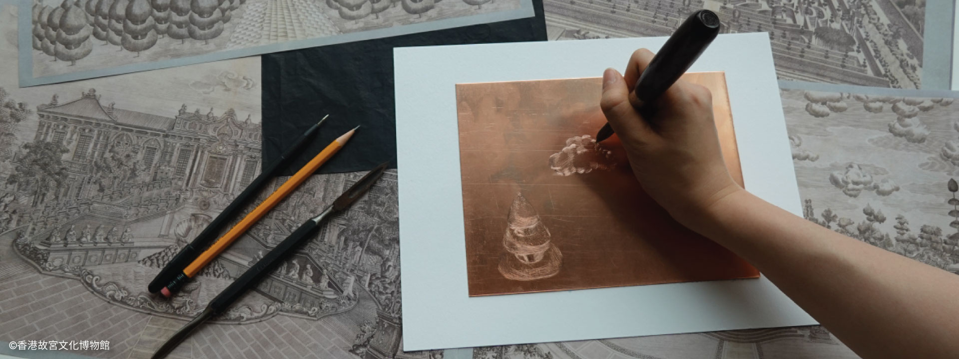 銅版畫源自歐洲,一般以直刻或腐蝕方法在金屬版上先製作圖案,再印於紙上。工作坊以香港故宮文化博物館「香港賽馬會呈獻系列:修明武備──故宮博物院藏清代軍事文物」中展出的一系列清宮銅版畫為靈感,讓參加者認識銅版畫的技藝和發展,並體驗製作過程。